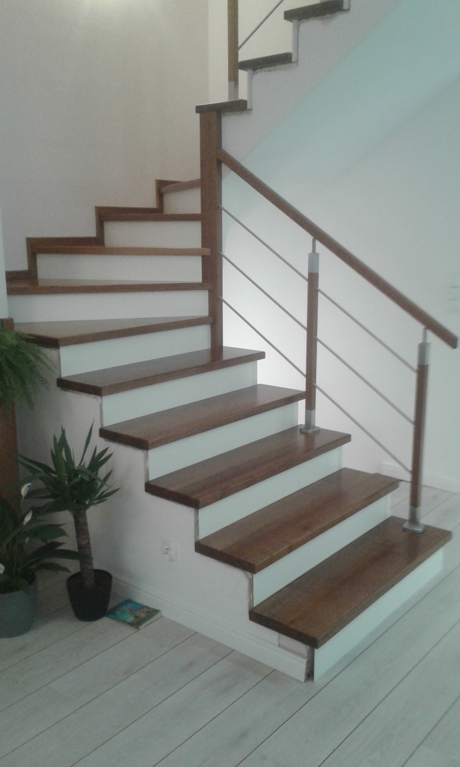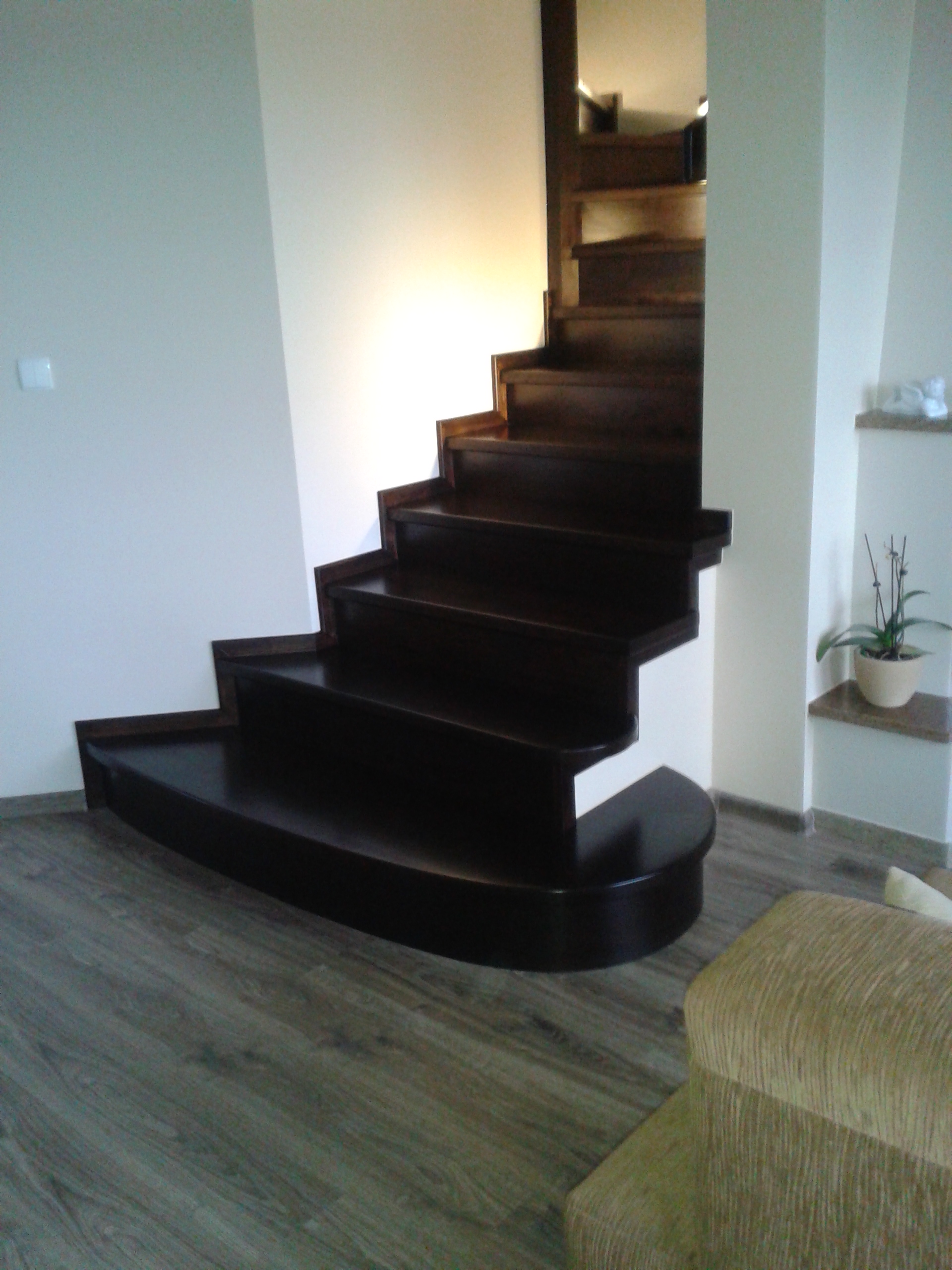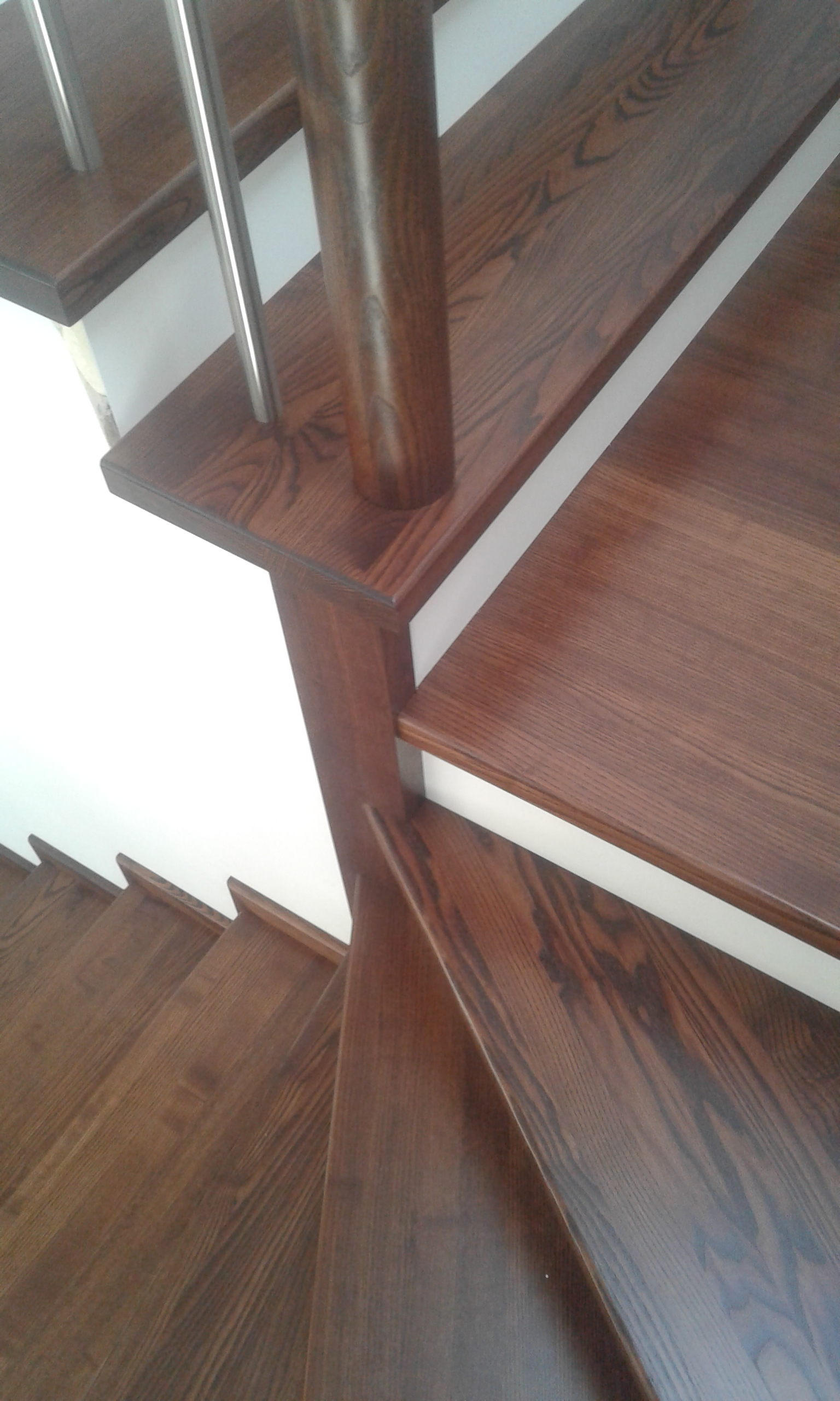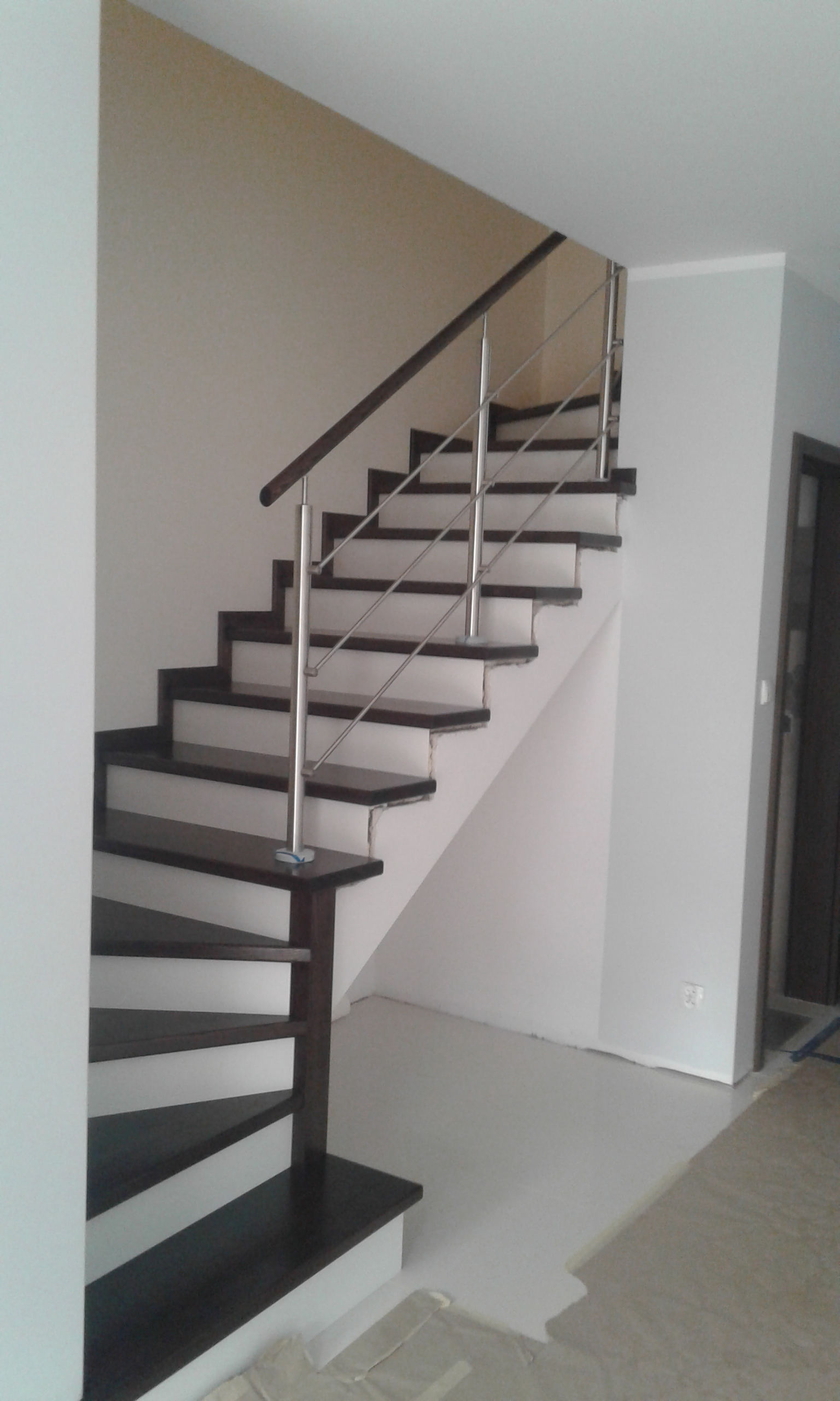 Stopnie i podstopnie z drewna dębowego barwione i lakierowane. Balustrada,słupki stal nierdzewna,trzy relingi nierdzewne,poręcz drewno okrągła fi 42