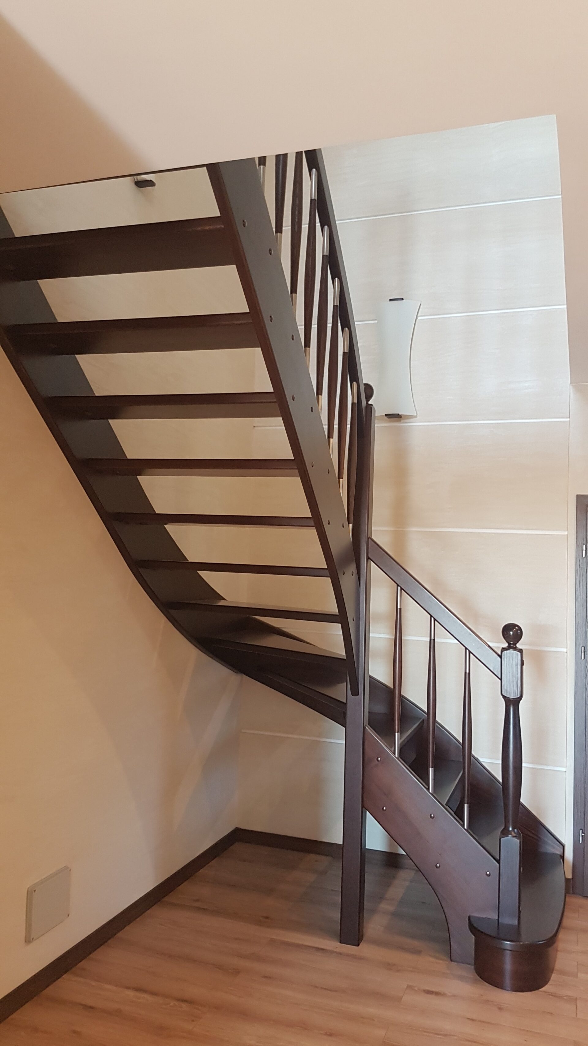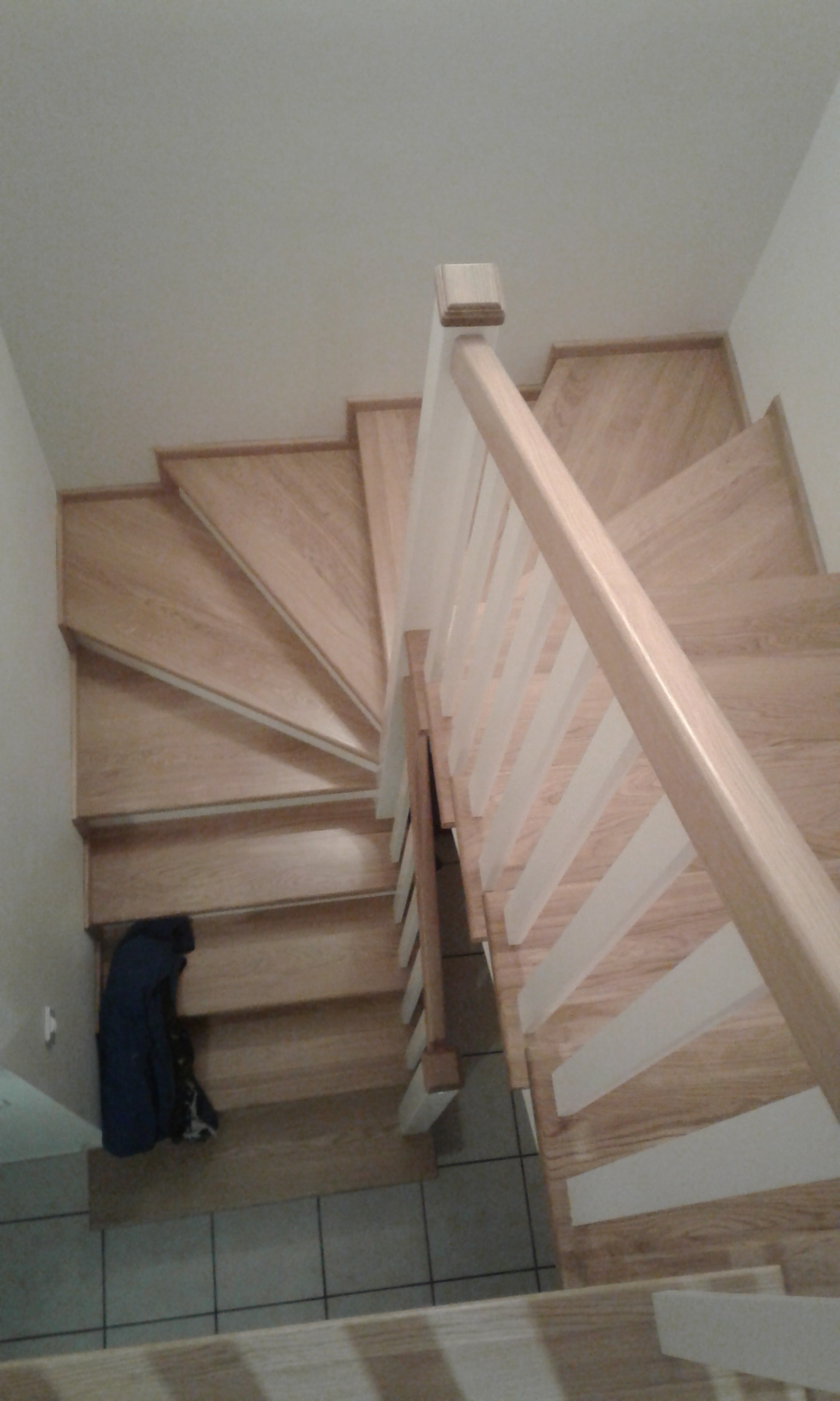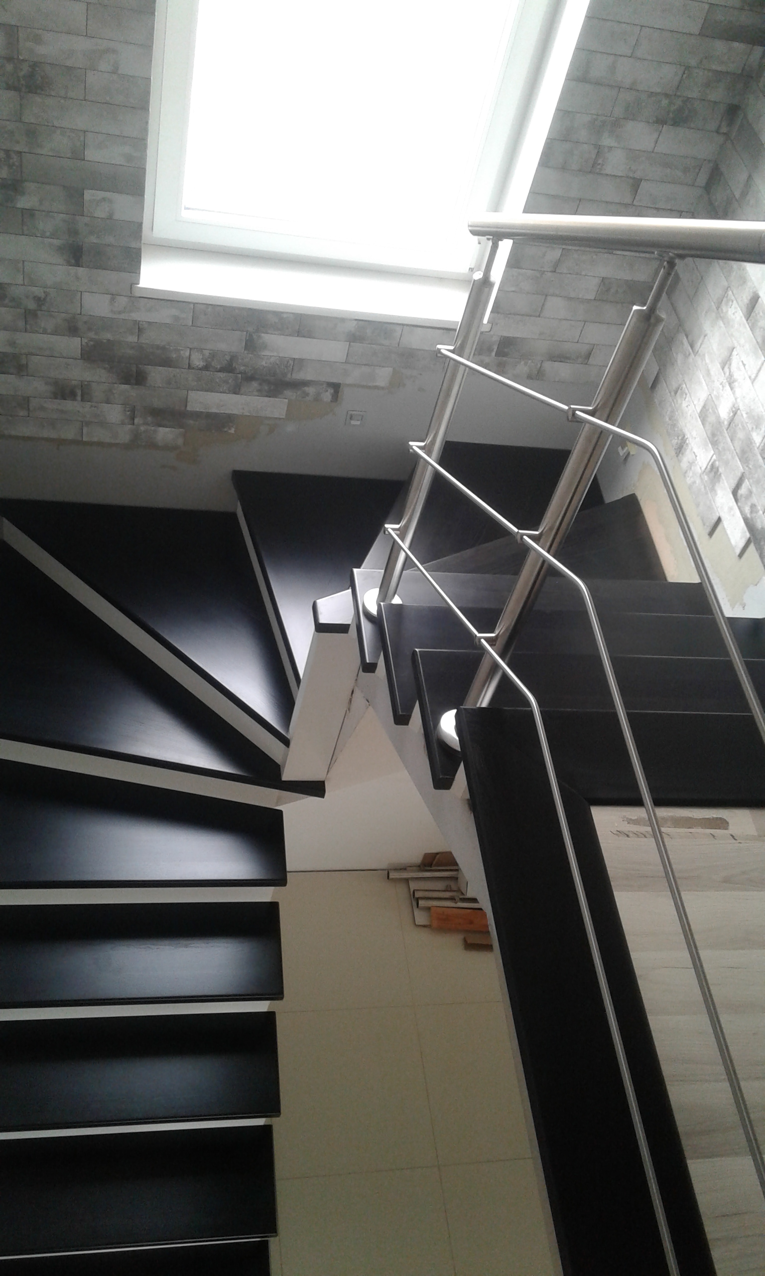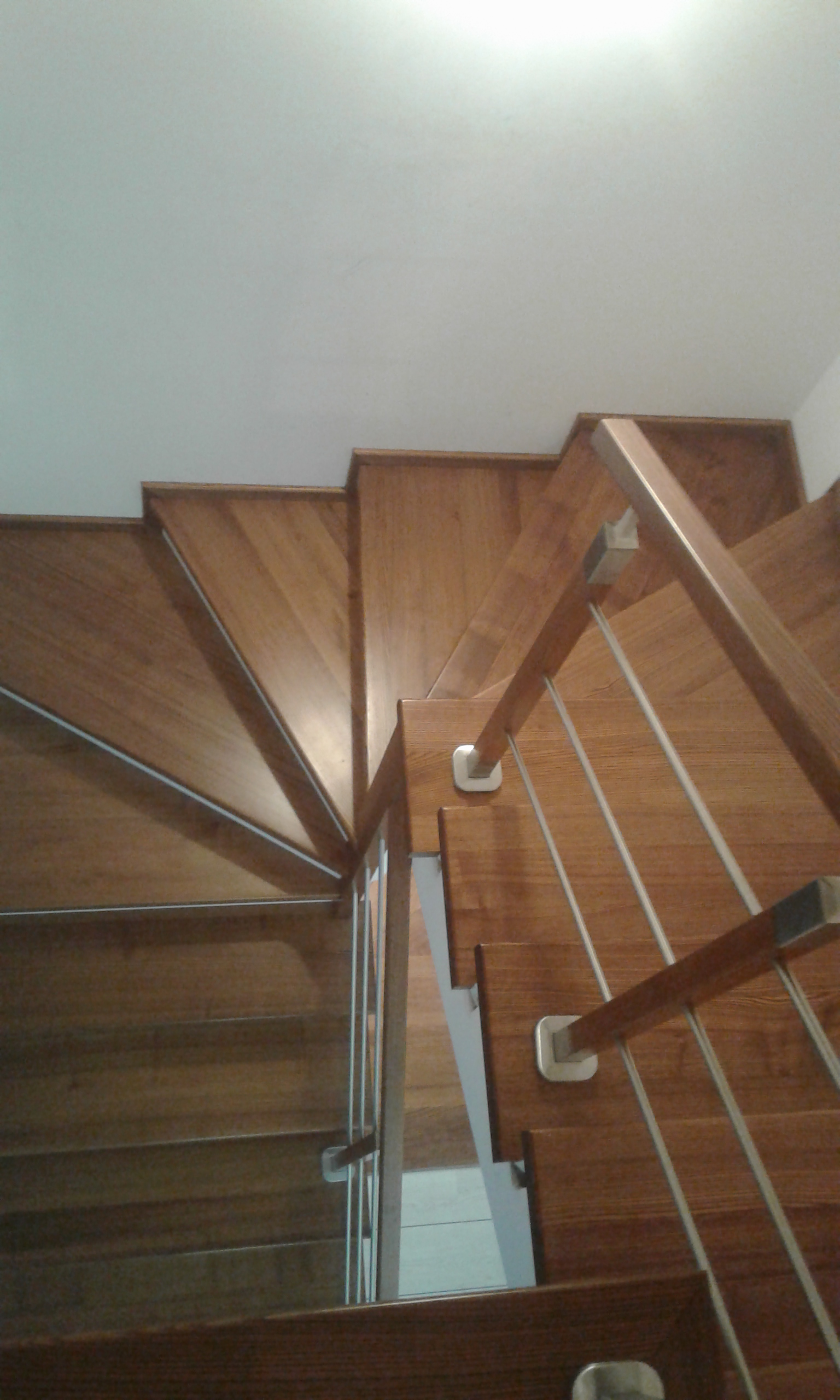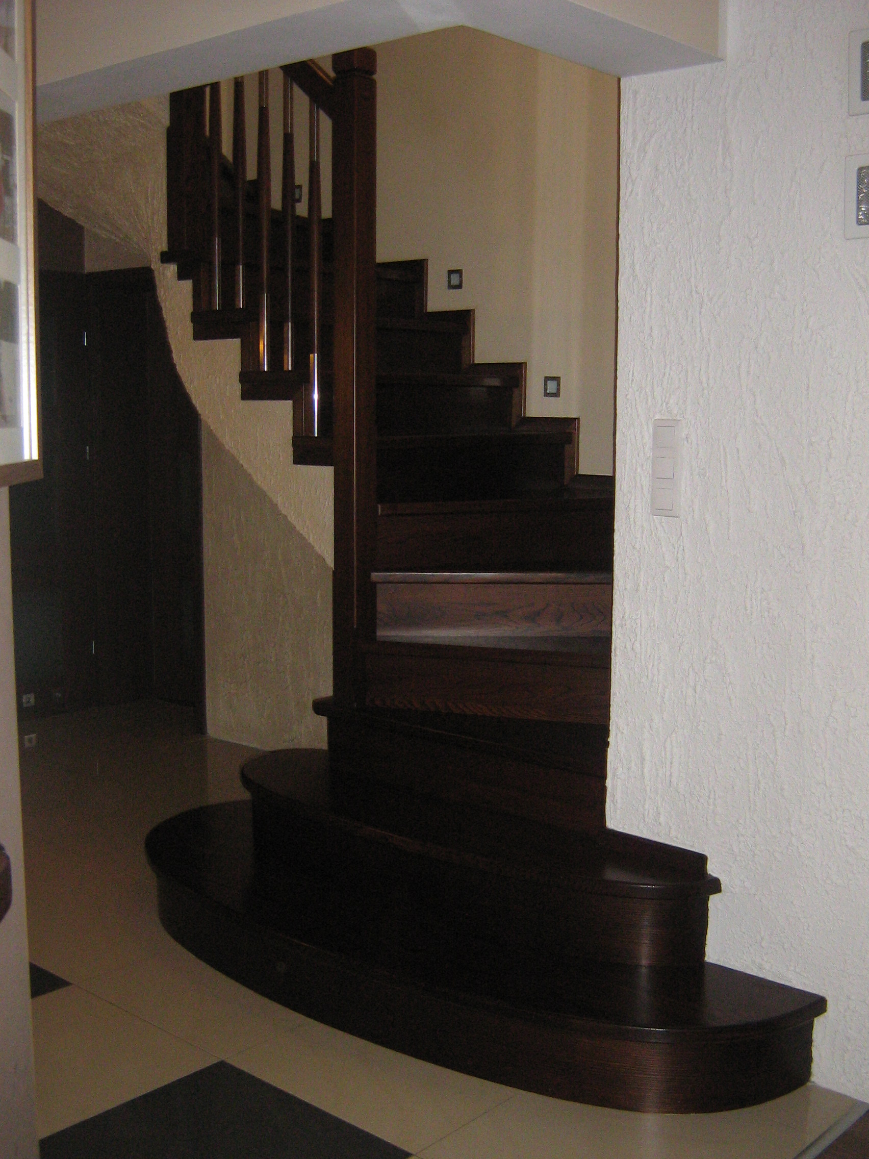 Stopnie i podstopnie z drewna dębowego barwione i lakierowane. Balustrada,słupki stal nierdzewna,trzy relingi nierdzewne,poręcz drewno okrągła fi 42