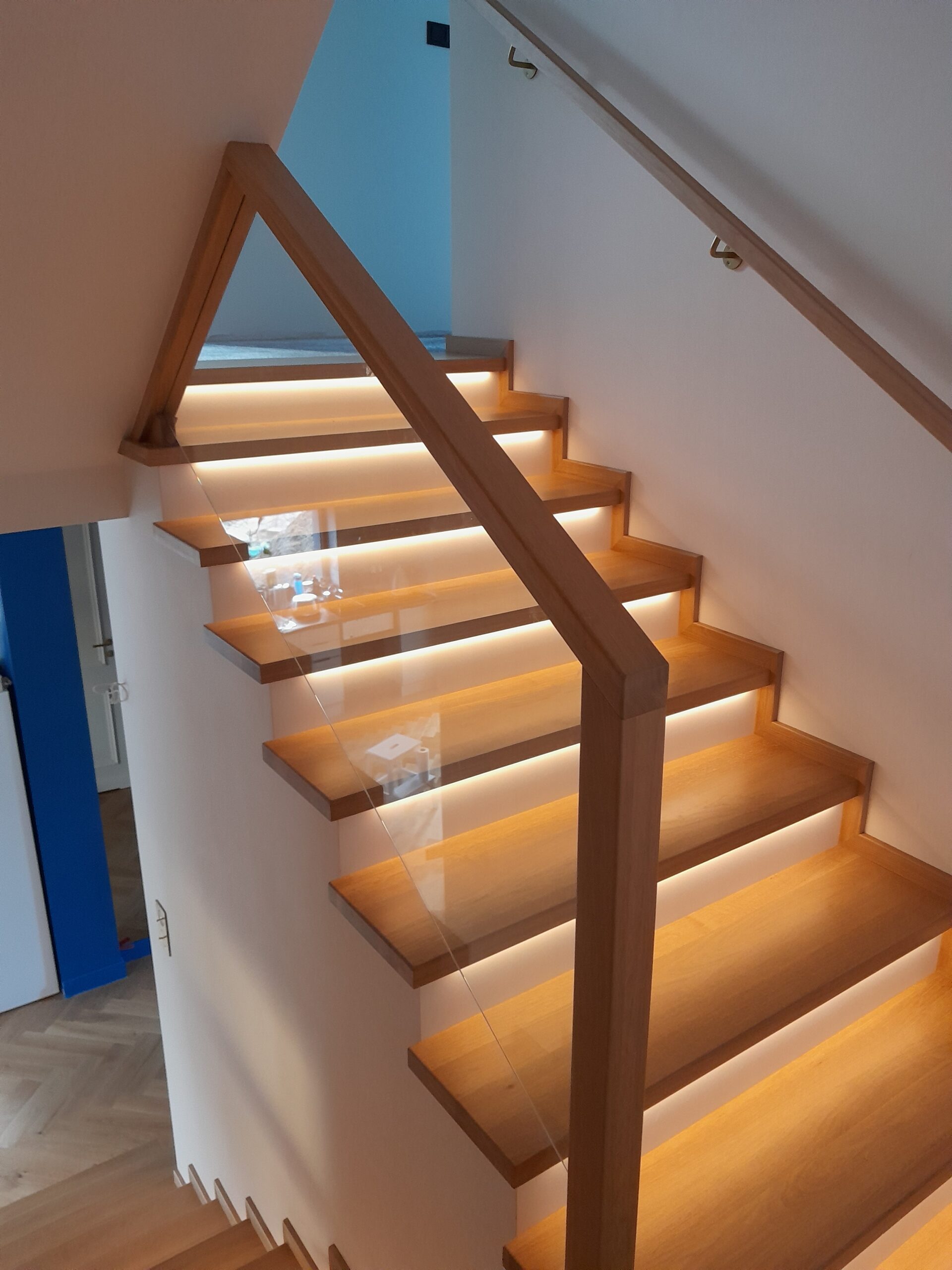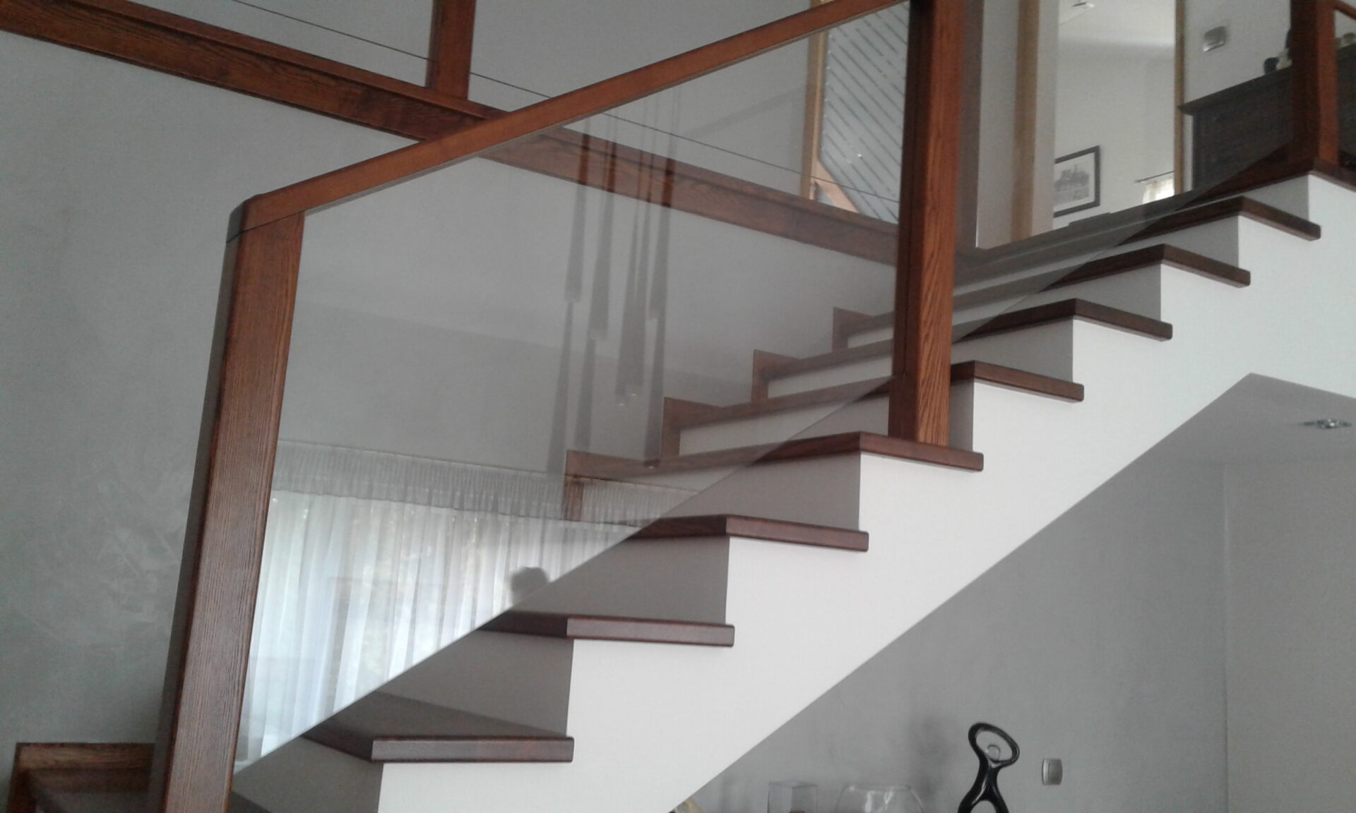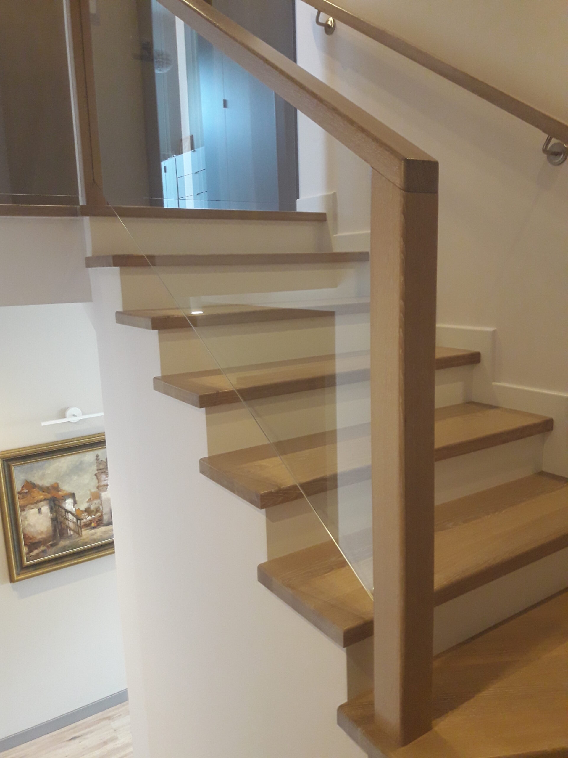 Stopnie jesion bejcowany, podstopnie białe, balustrada szkło bezpieczne bezbarwne