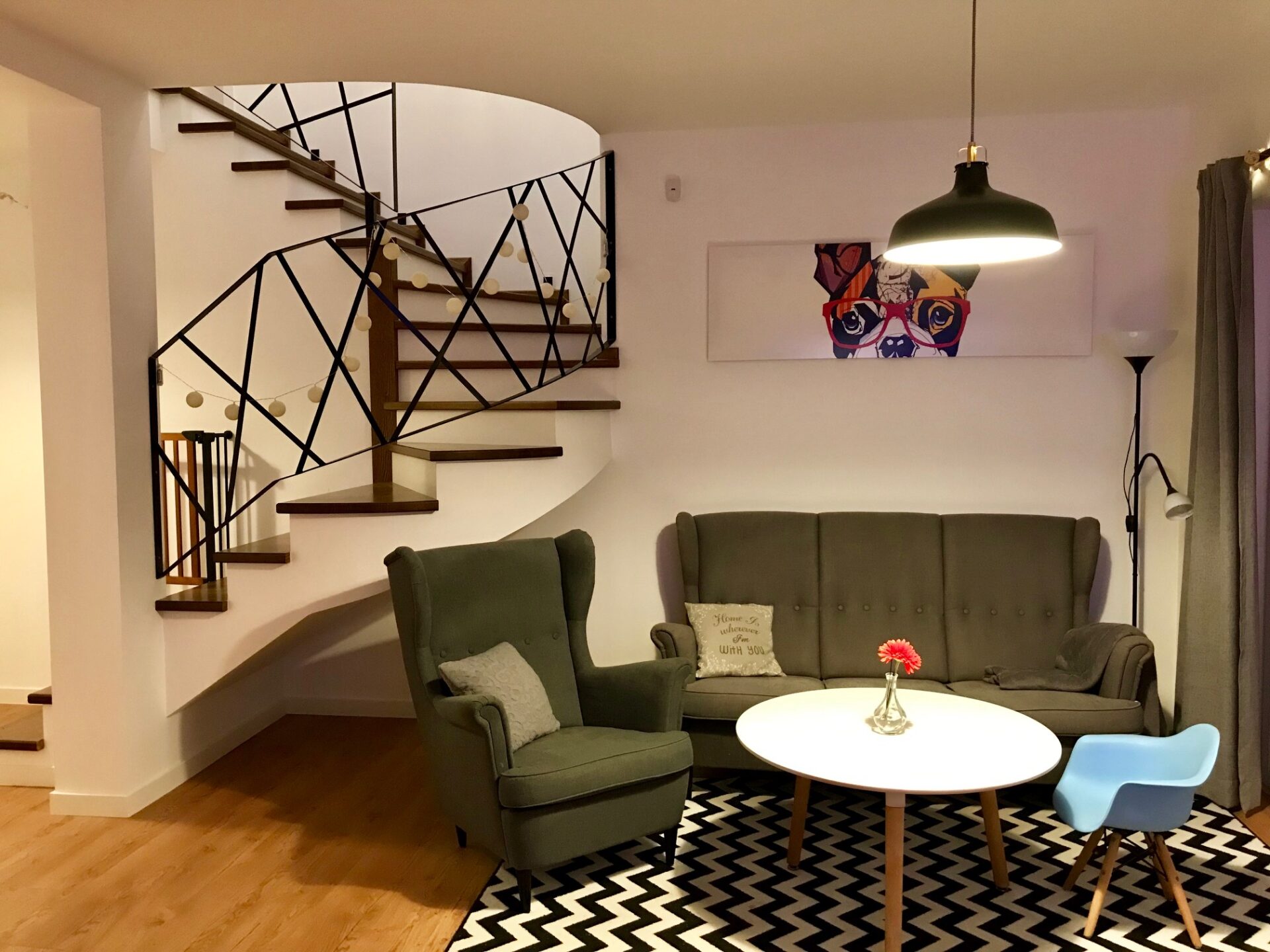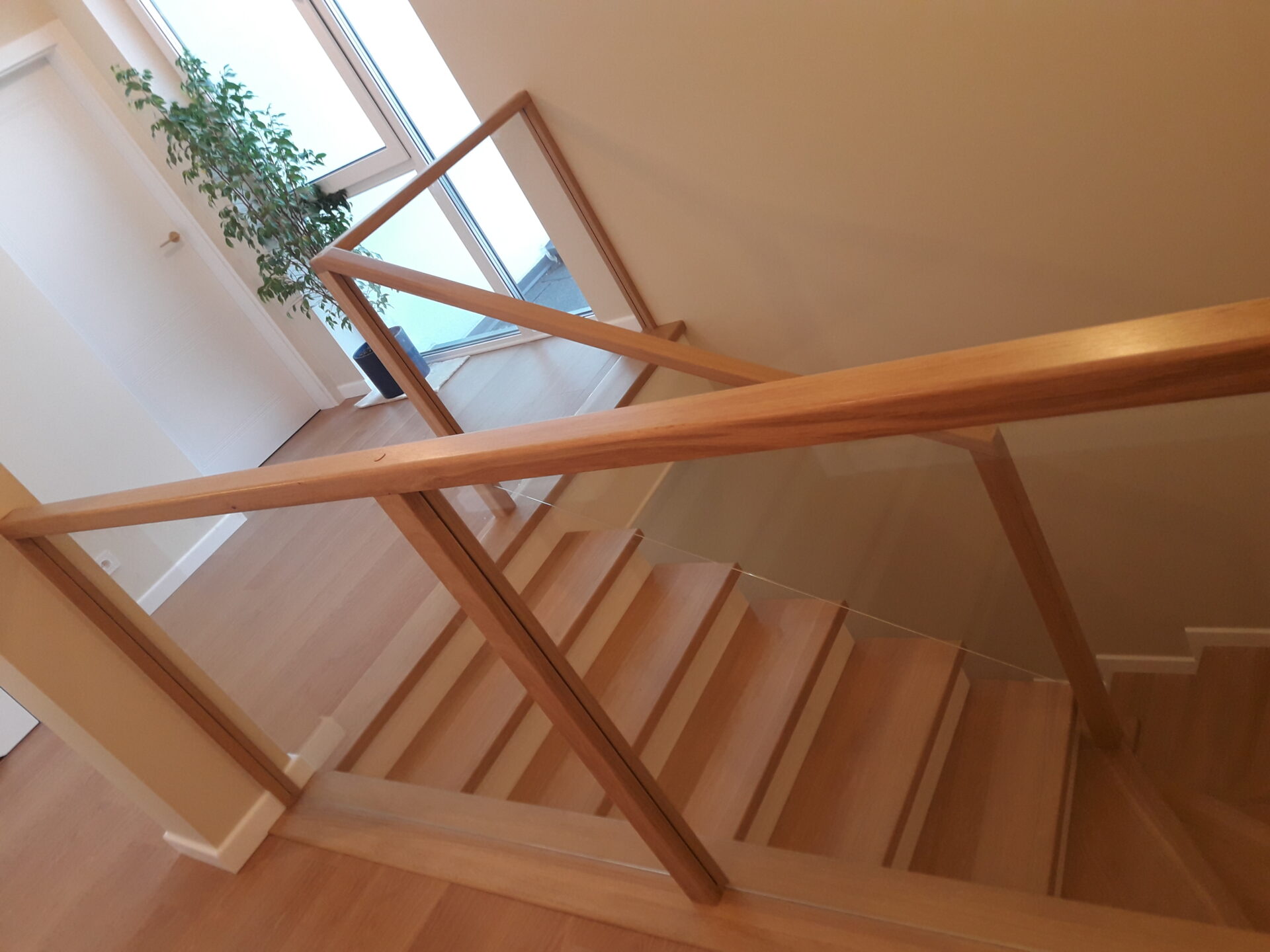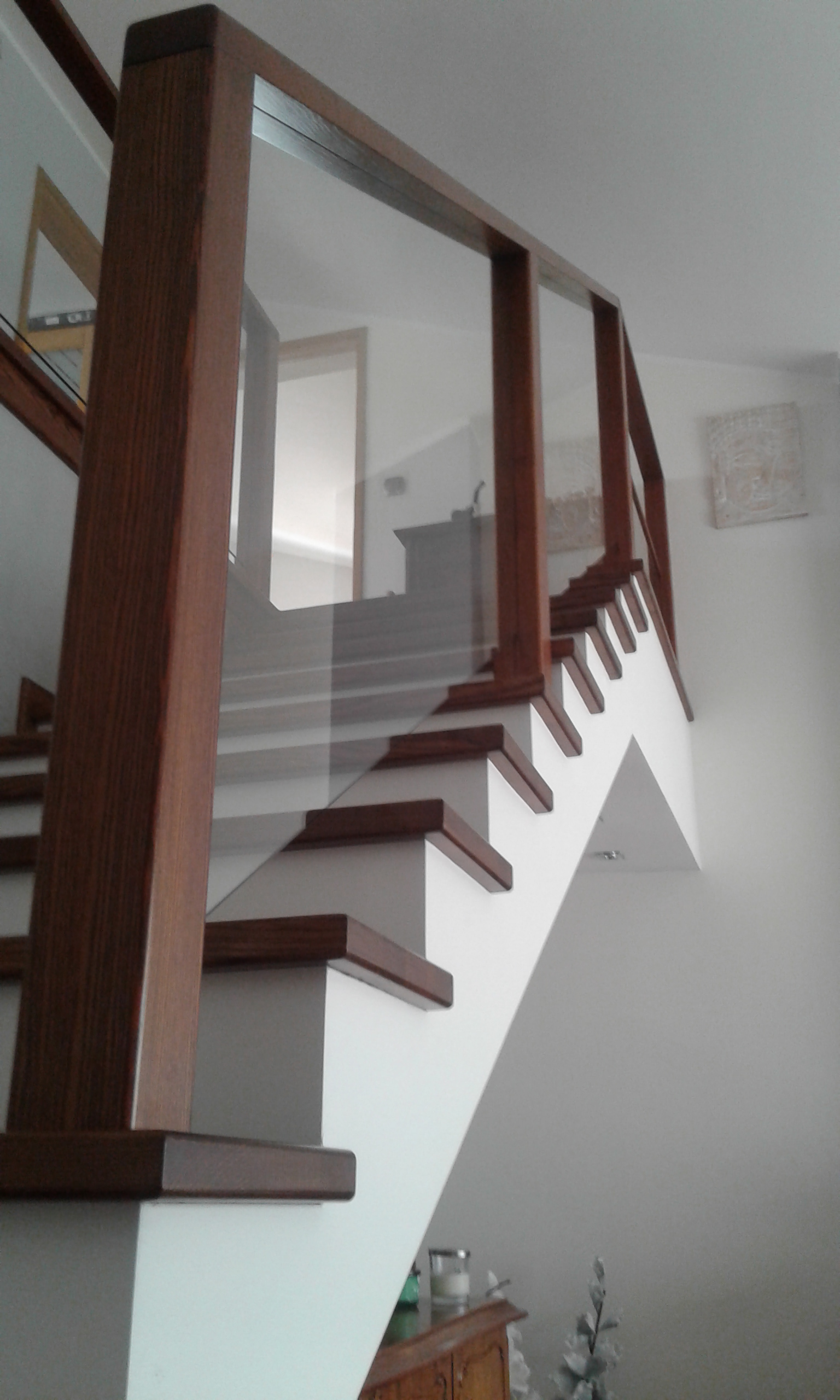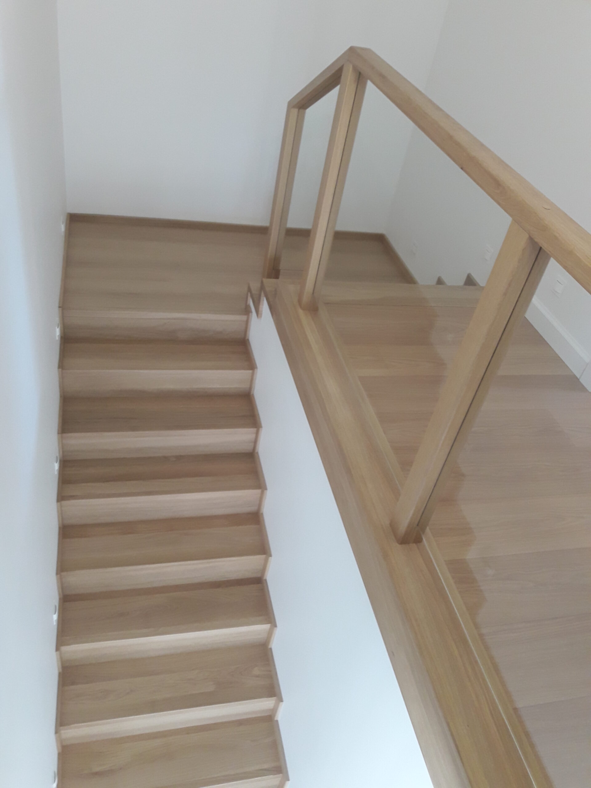 Stopnie jesion bejcowany, podstopnie białe, balustrada szkło bezpieczne bezbarwne