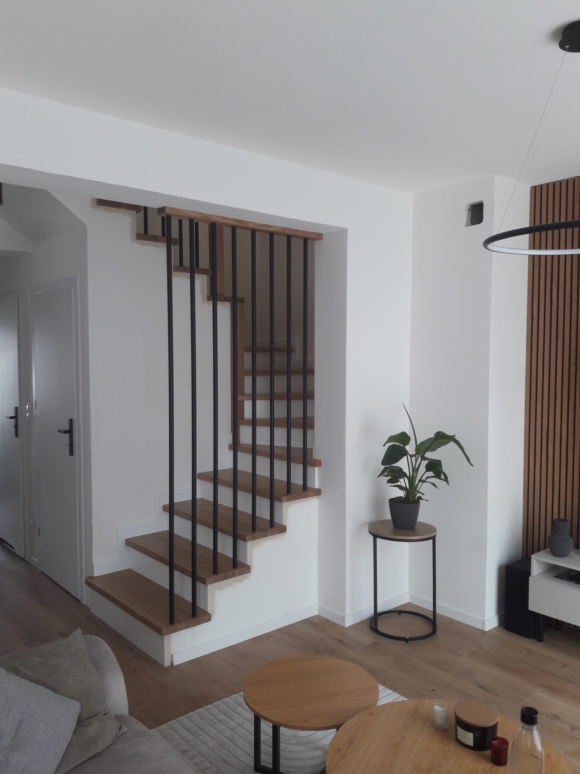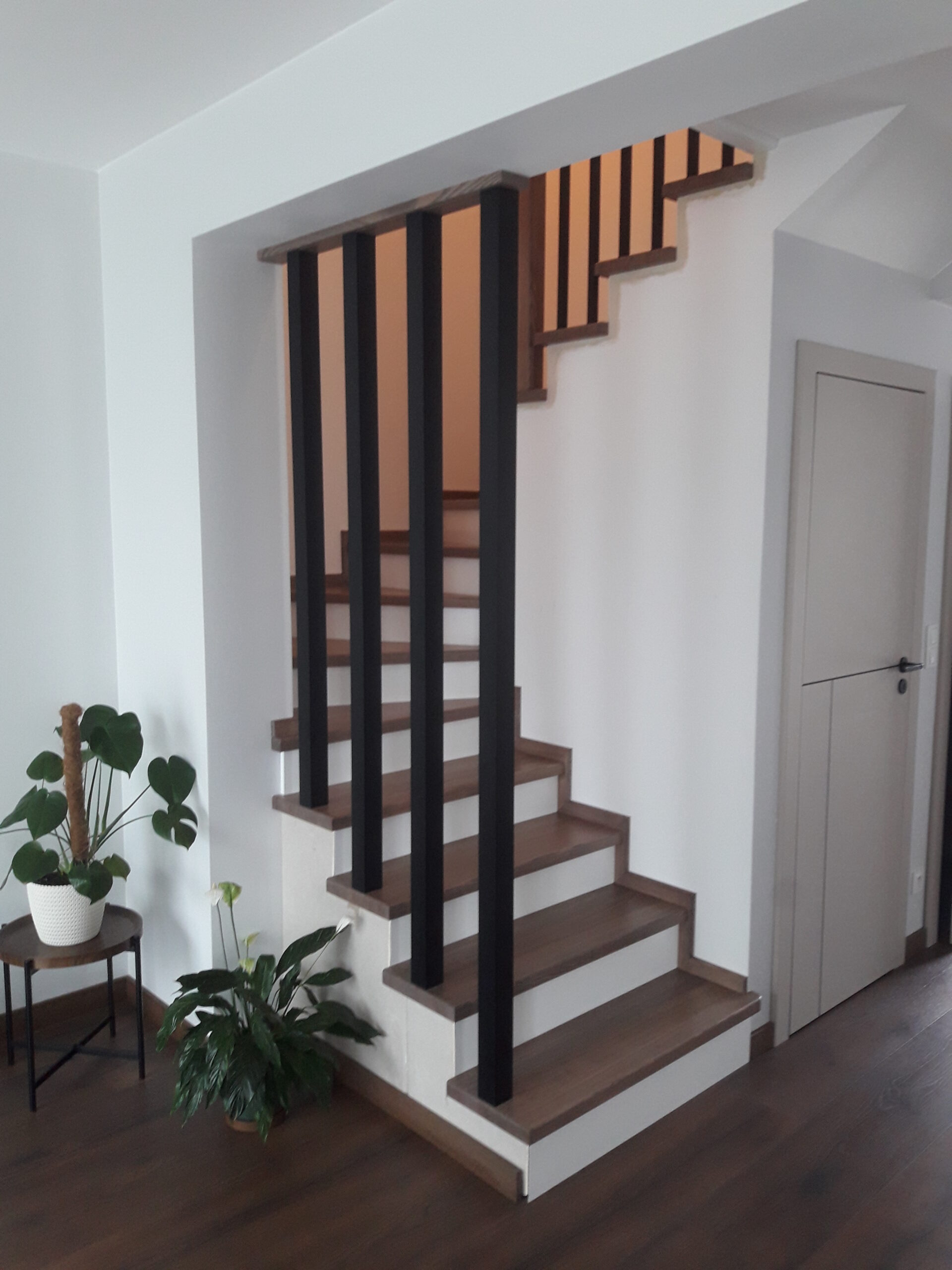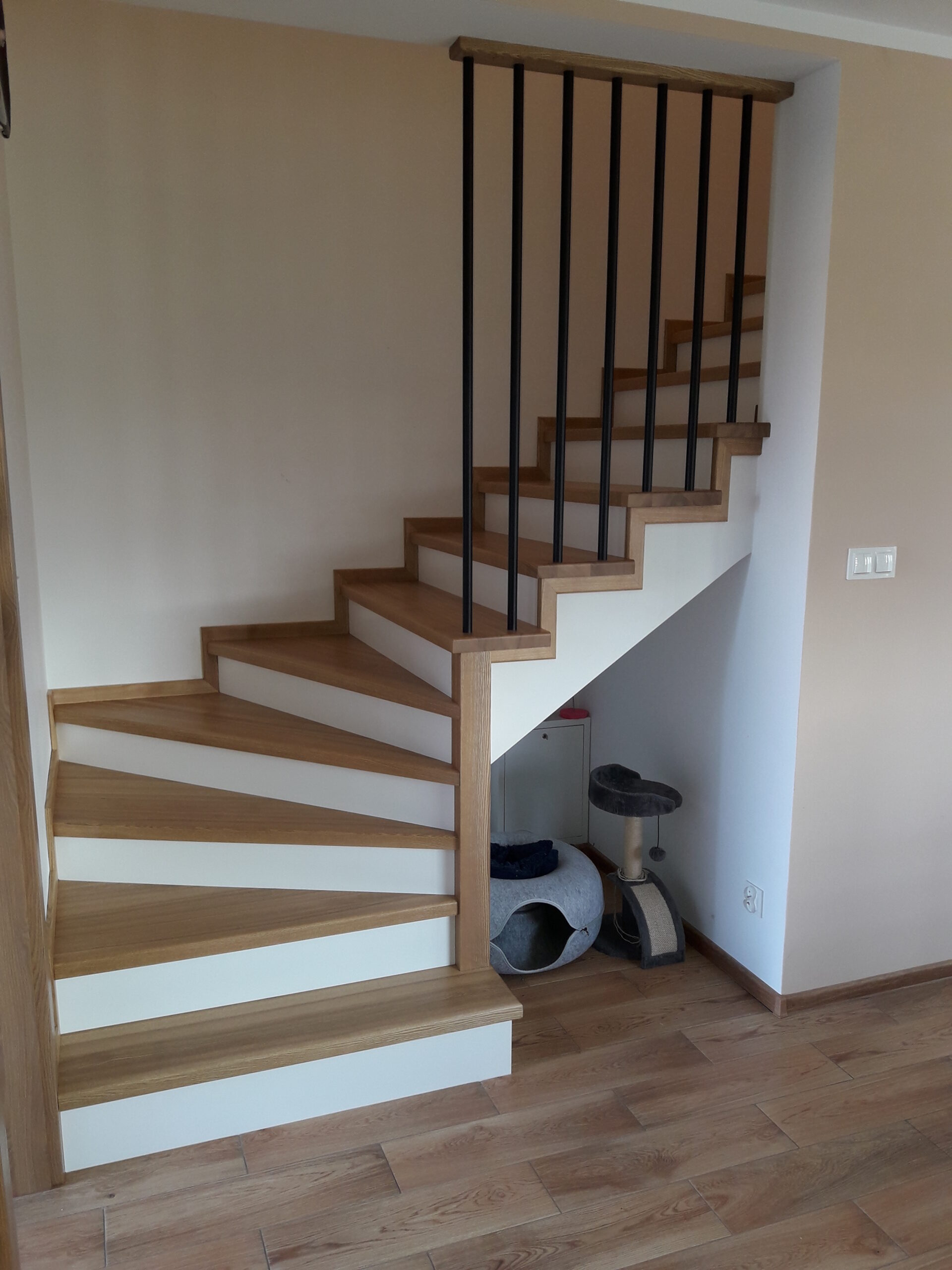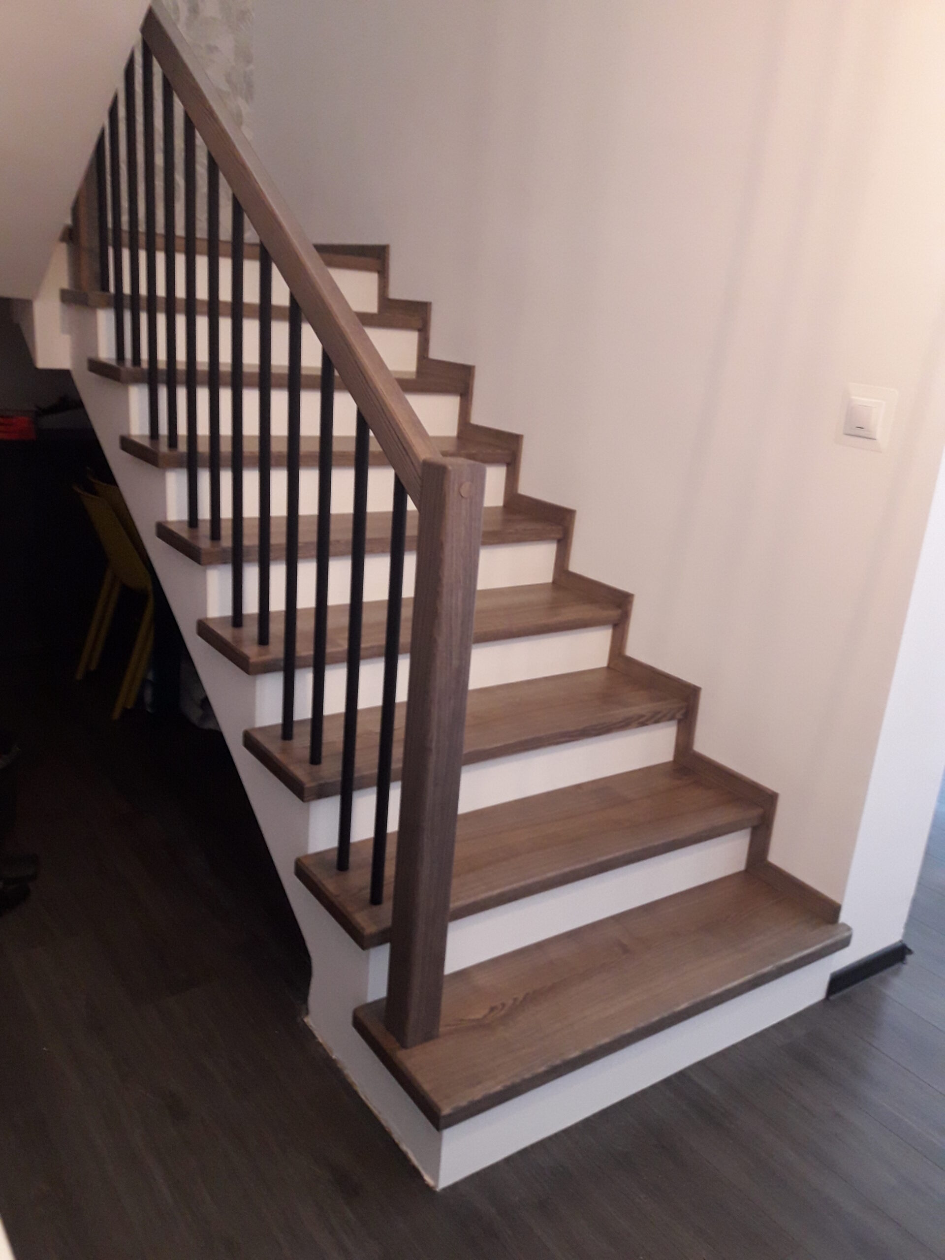 Stopnie z drewna jesionowego, podstopnie białe,wykończenie opaska 1x, balustrada metalowa