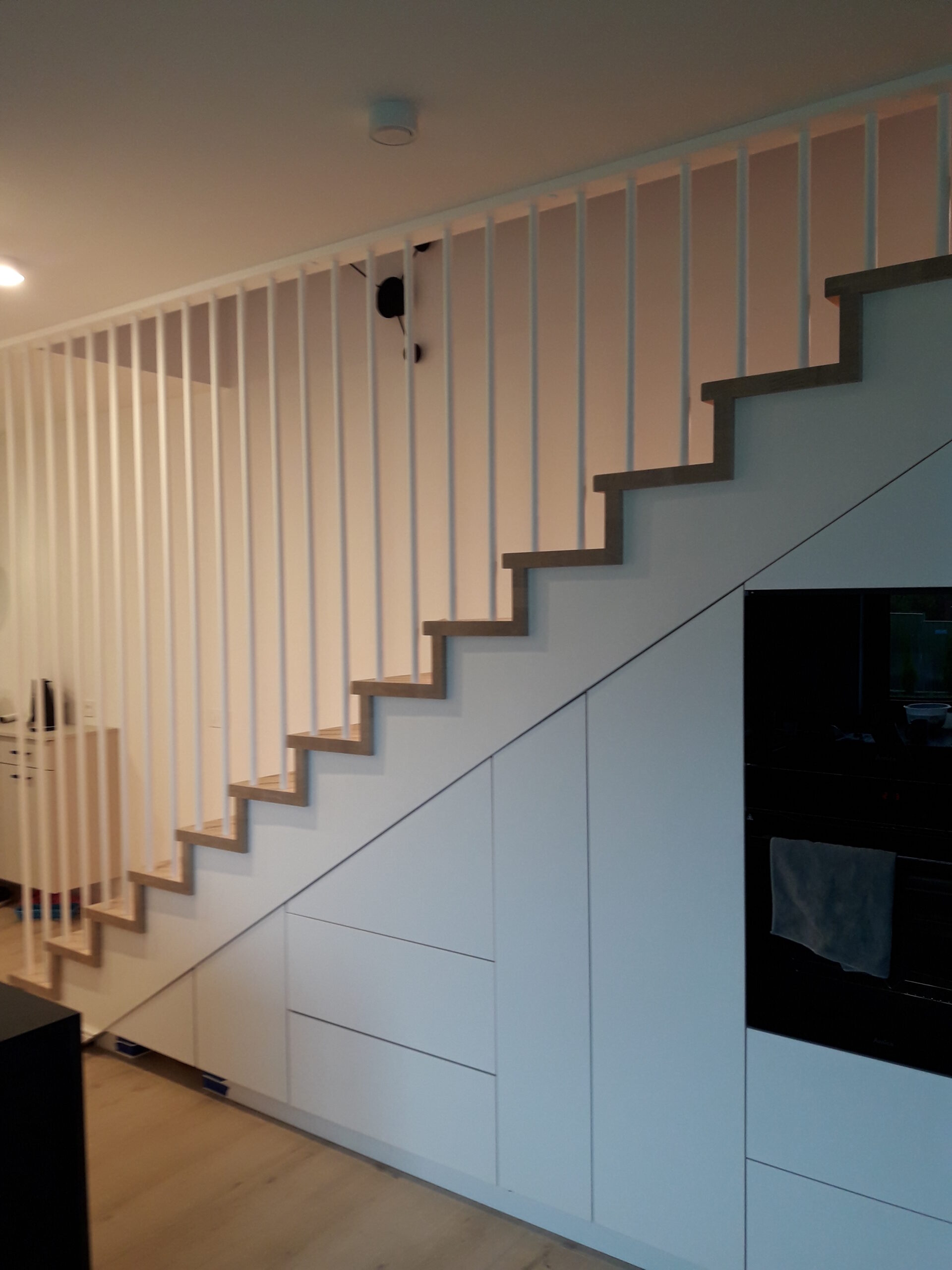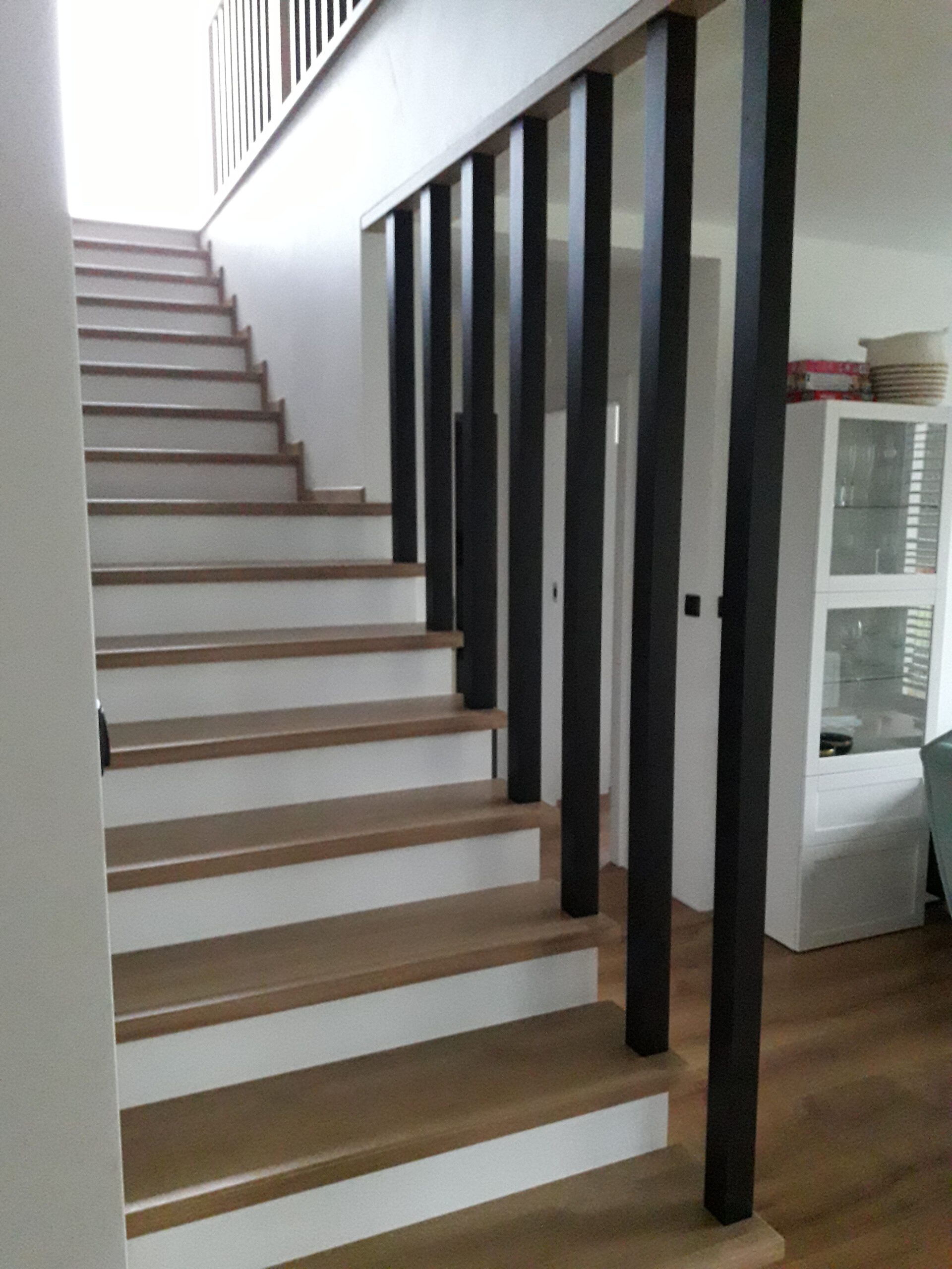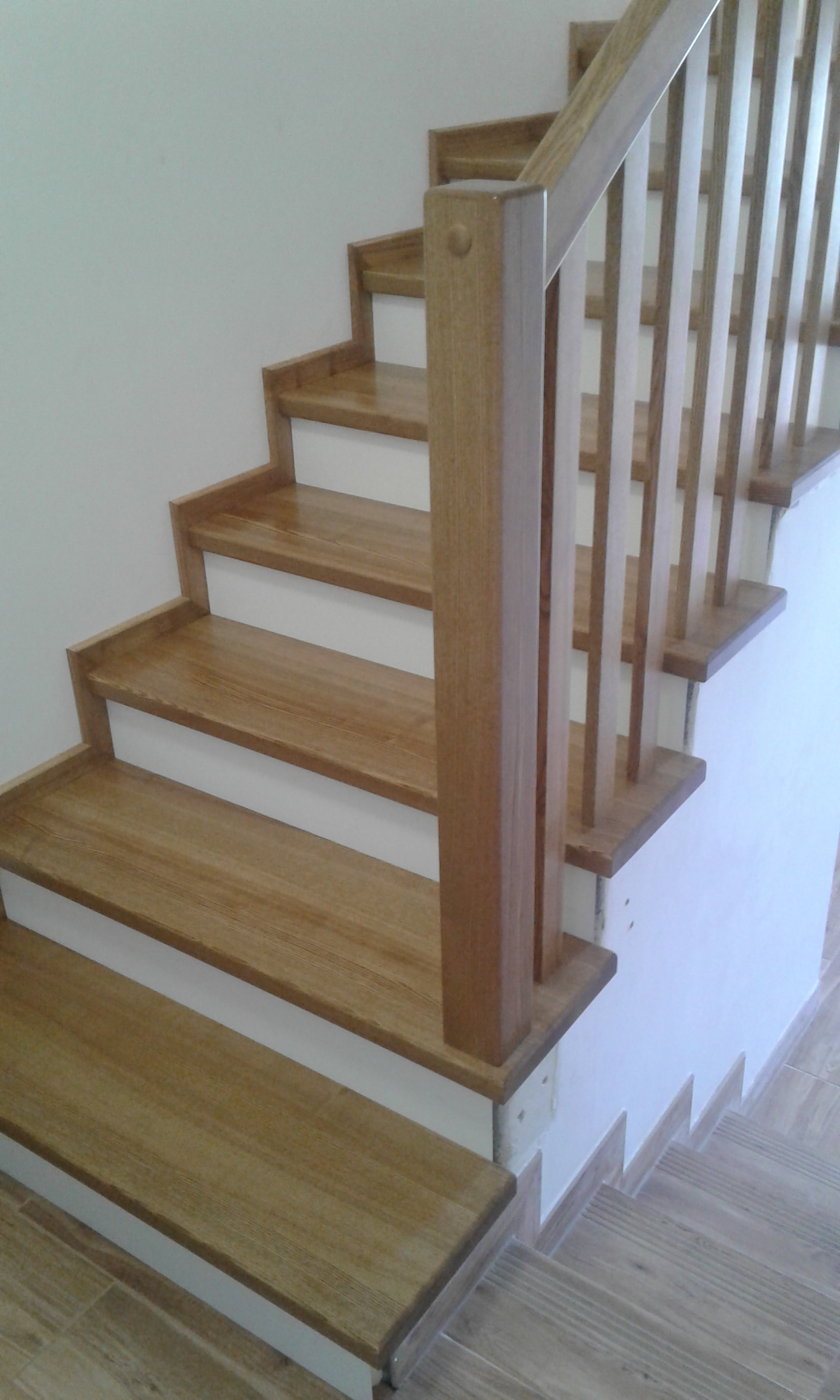 Stopnie z drewna jesionowego, podstopnie białe,wykończenie opaska 1x, balustrada metalowa