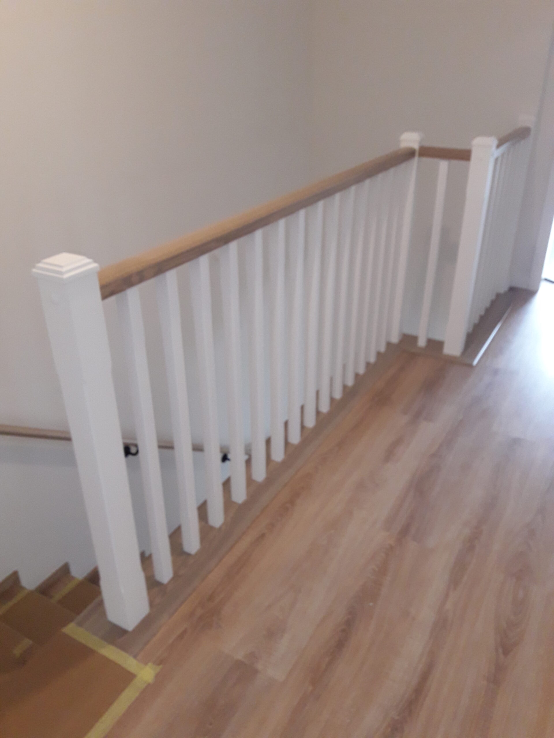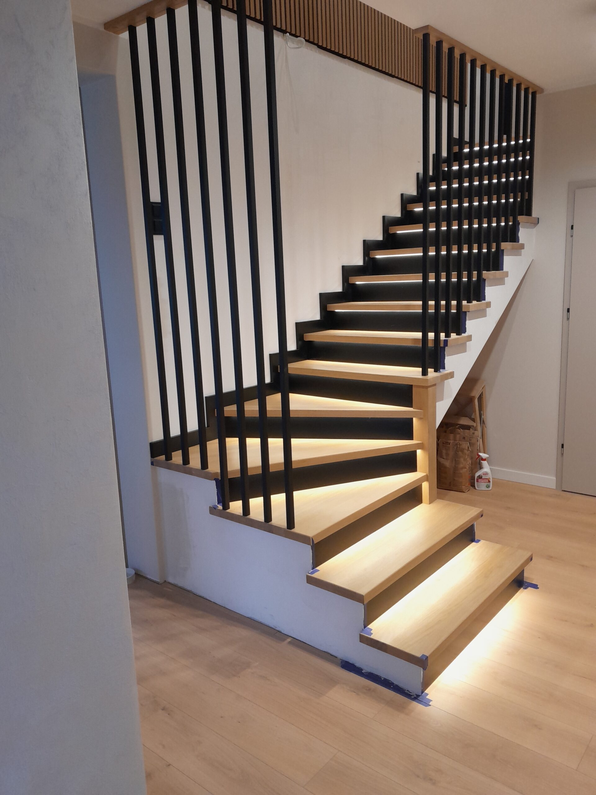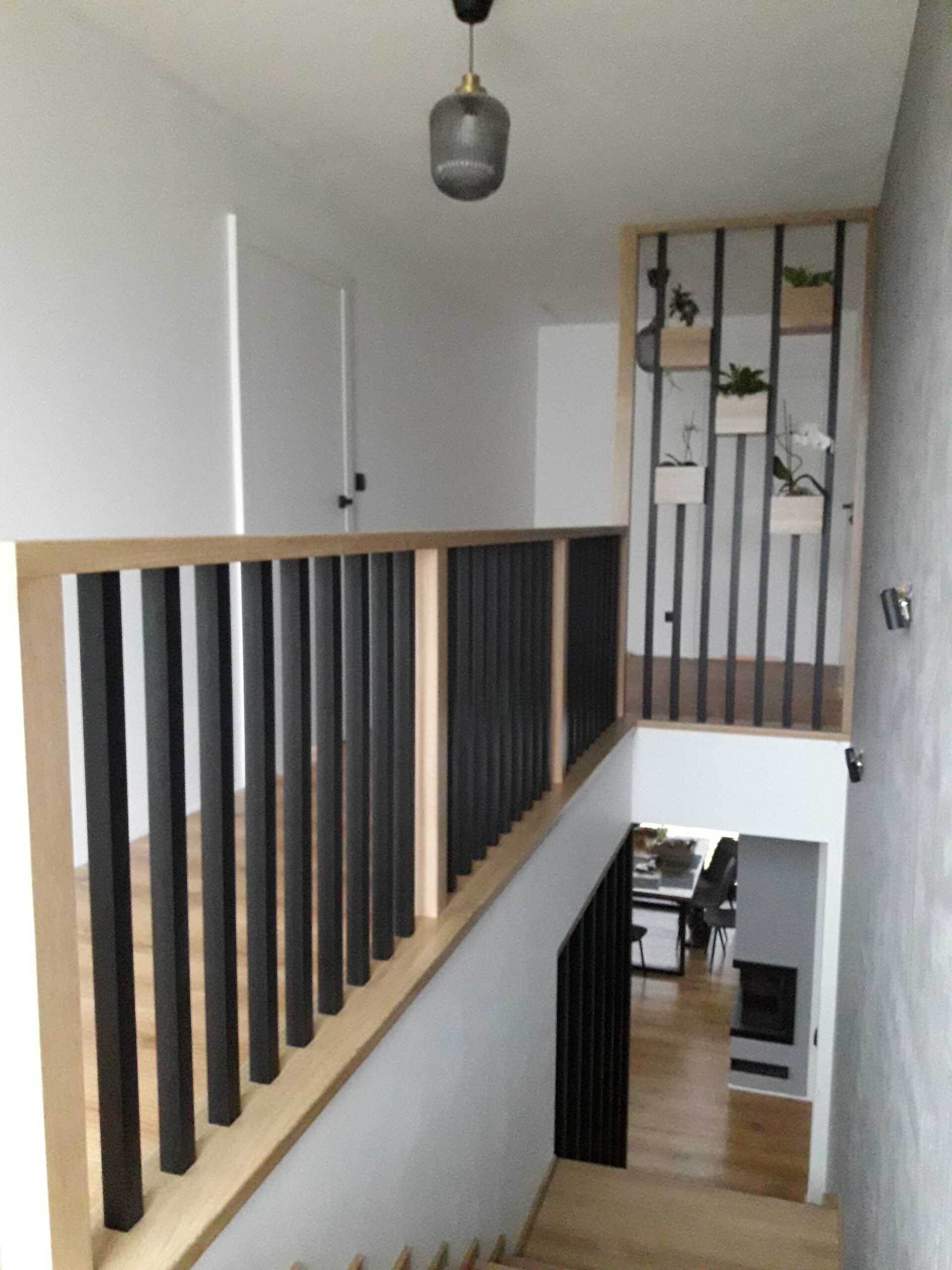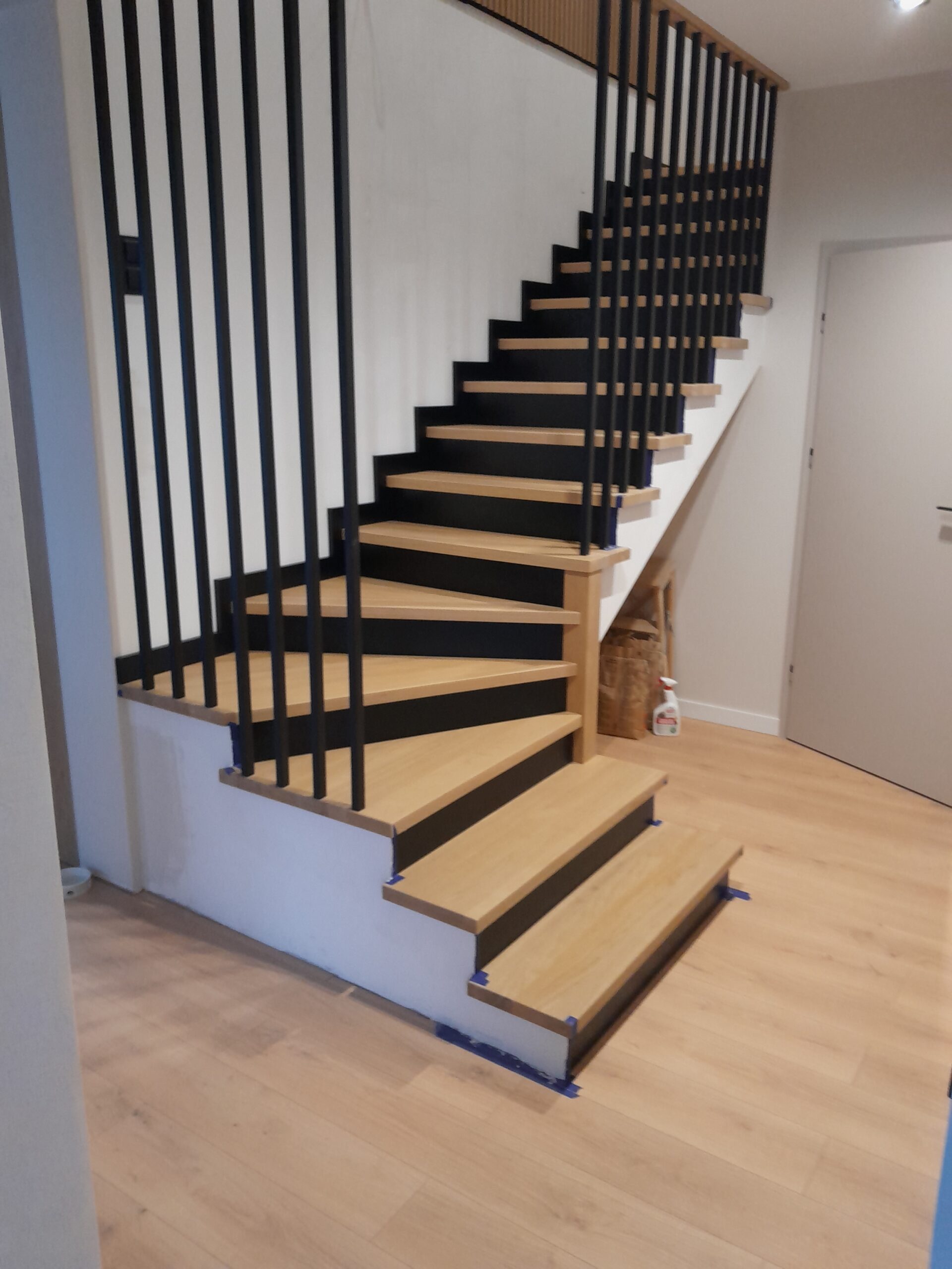 Stopnie z drewna jesionowego, podstopnie białe,wykończenie opaska 1x, balustrada metalowa